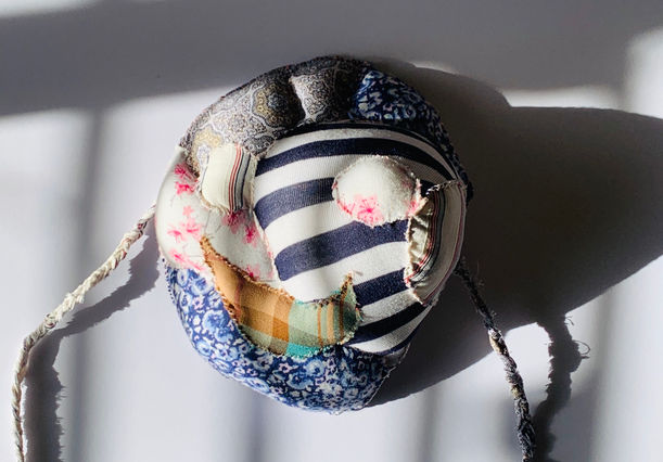 Regarded it as a kind of protection, not only the physical body but also mental protection. In this piece, all used my collection of old clothes disassembled to several pieces of fabric, as well as the wire. Sew it together by hand make head protection jewellery (also see as this is a - helmet).